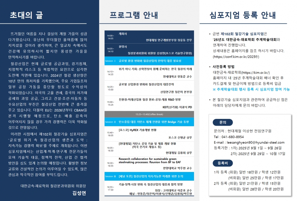 대한금속·재료학회는 10월 30일, 광주 김대중컨벤션센터 4층 컨벤션3에서 제102회 철강기술심포지엄을 연다고 밝혔다. ‘글로벌 위기 속 철강산업의 생존과 도약: 지속가능 경쟁력 확보 전략’을 주제로 열리는 본 심포지엄은 대한금속·재료학회 철강분과위원회가 주최하고 현대제철 연구개발본부가 행사 주관을 맡았다.