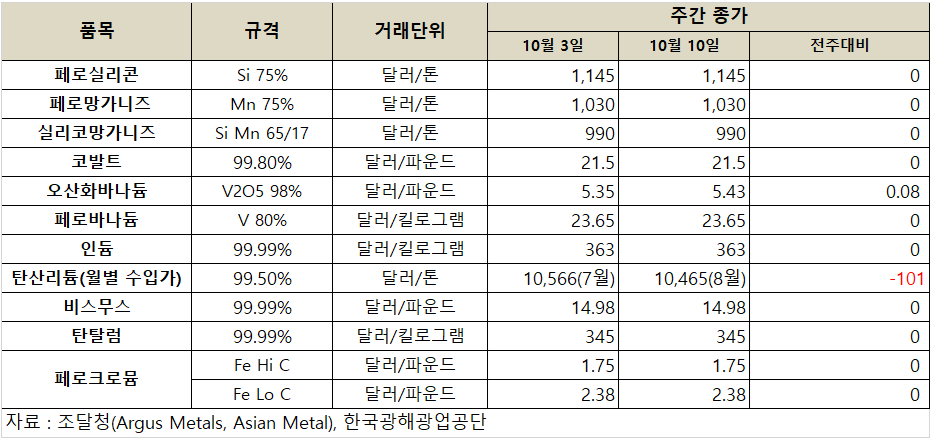 [표] 희유금속 가격 동향(10월 10일)