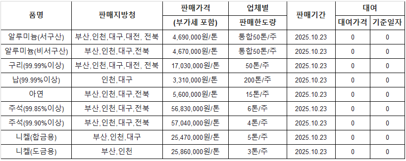 [표] 조달청 방출 가격(10월 23일)