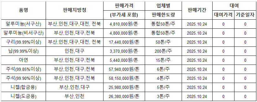 [표] 조달청 방출 가격(10월 24일)