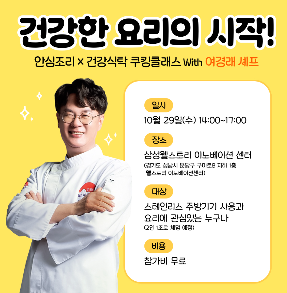 포스코는 오는 29일 오후 2시, 경기도 성남시 삼성웰스토리 이노베이션센터에서 ‘건강한 요리의 시작’을 주제로 여경례 쉐프가 진행하는 쿠킹클래스를 열 계획이라고 밝혔다. 이번 행사는 한국철강협회와 삼성웰스토리도 참여한다.