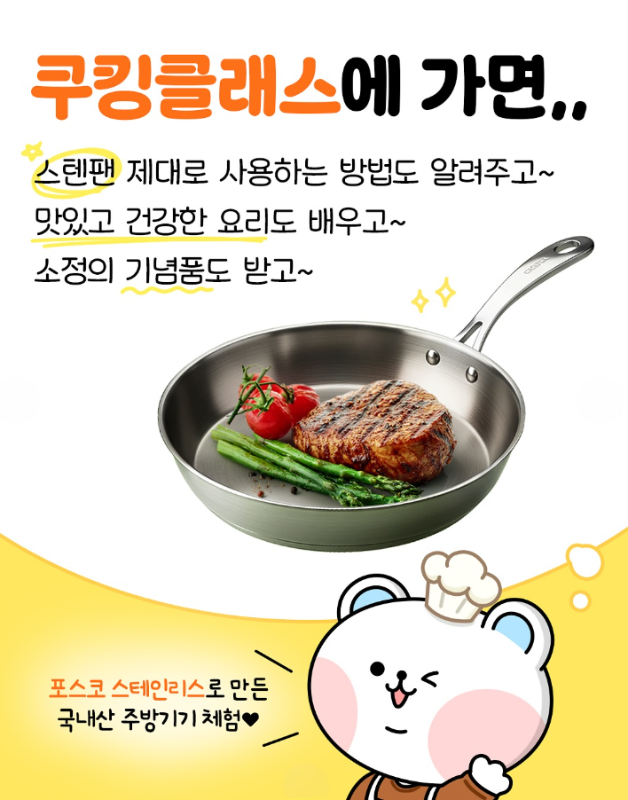행사는 지난 21일까지 인스타그램, 페이스북 등 포스코의 SNS 계정을 통해 온라인으로 참여 신청한 2인 1조 희망자들 중 국산 스테인리스 주방기기를 사용하고 요리에 관심이 있는 인원을 선정(27일)하여 진행한다. 특히 맛있고 건강한 요리법 교육과 함께, 국산 스테인리스 프라이팬의 최적의 사용법, 소정의 기념품 등의 혜택이 주어진다.