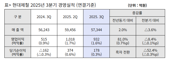 현대제철은 올해 3분기 연결기준 매출액 5조7,344억원, 영업이익 932억원, 당기순이익 178억원을 기록했다고 30일 밝혔다.