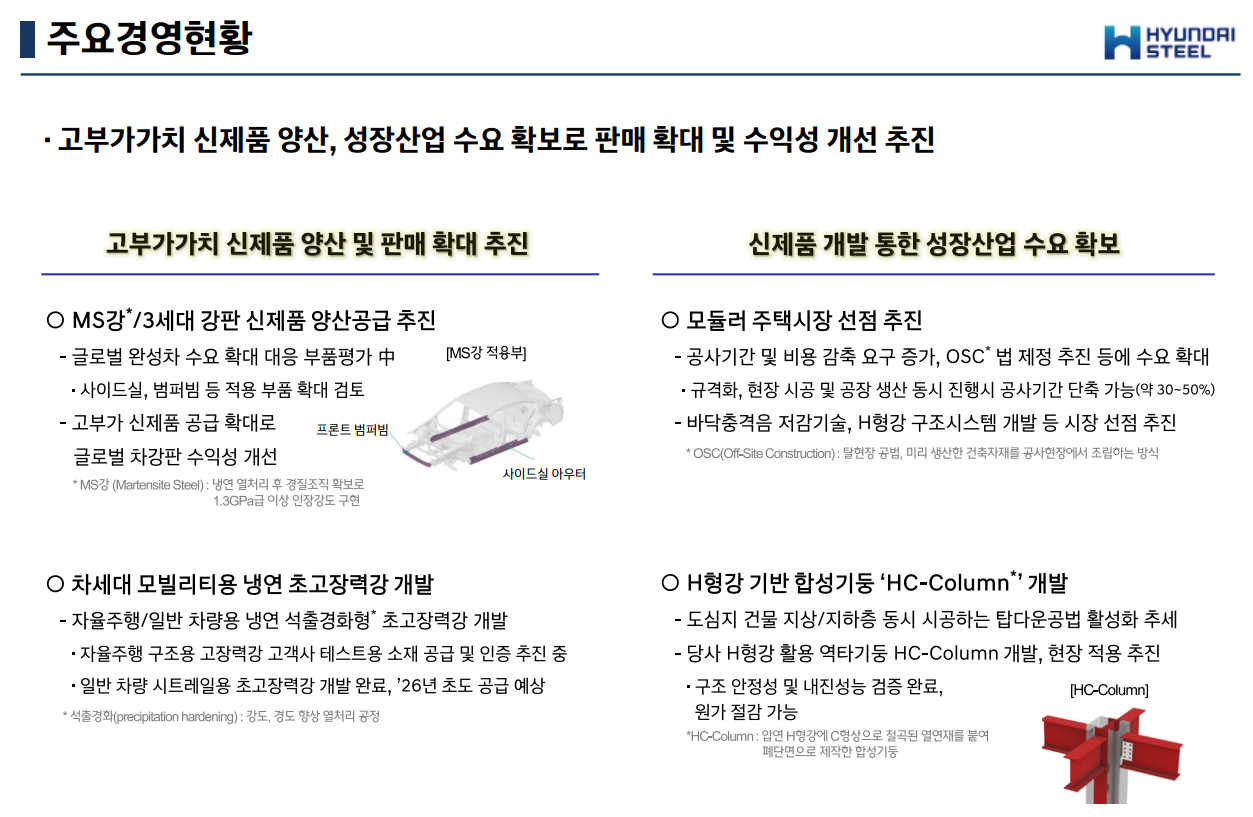 또한 현대제철은 고부가가치 신제품 양산 및 성장 산업 확보에도 집중하고 있다.