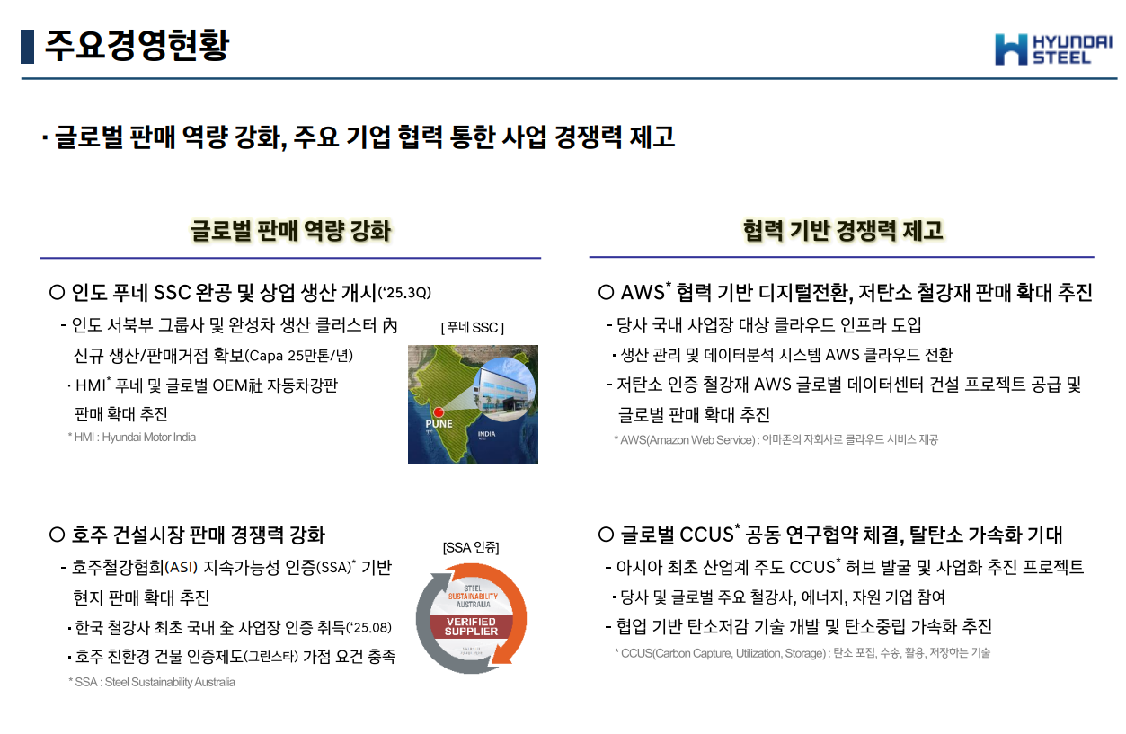 현대제철은 해외 거점을 확대하고 친환경 인증을 확보하는 한편, 글로벌 기업과의 협력을 통해 탈탄소 경쟁을 가속화하고 있다. 이와 관련해 현대제철은 인도 푸네 SSC를 완공하고 생산을 개시(25.3Q)하여 인도 서북부의 완성차 클러스터 내 신규 생산/판매 거점(연간 25만 톤)을 확보했다. 또한 HMI 등 글로벌 OEM사에 자동차 강판 판매를 확대할 계획이다.