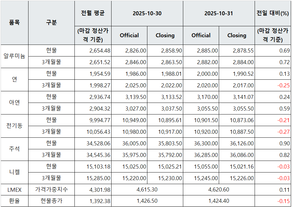 [표] LME 비철금속 및 환율 동향(10월 31일)