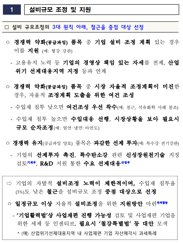정부는 공급과잉 등 경쟁력 약화 철강 품목(철근·형강·강관 등) 중 기업 설비 조정 계획 있는 경우 이를 지원하는 방식을 취할 것이라고 설명했다. 현재 개별 기업이 진행 또는 추진할 예정인 자율적 조정계획이 미진한 경우, 자율적 조정계획 도출을 위한 여건 조성하기 위해 정부가 조정기능을 발휘할 수 있다는 의미다.