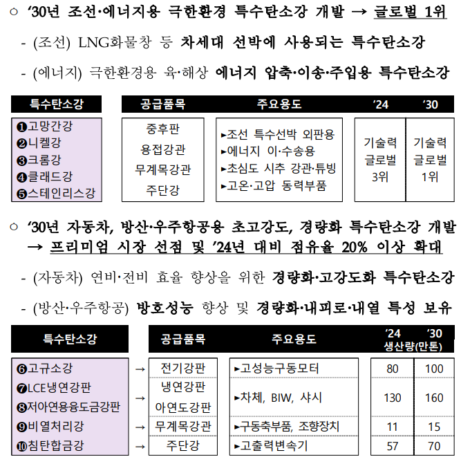또한 정부는 자동차·방산·우주항공용으로도 초고강도, 경량화 특수탄소강을 개발 지원할 방침이다. 이들 유망 미래 산업에서 고부가 소재 시장을 선점하도록 지원하여 시장 점유율을 2024년 대비 20% 이상 확대한단 전략이다.