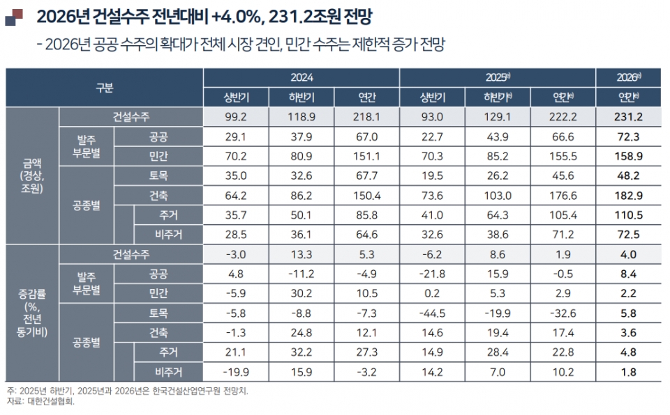 건산연은 4일 서울 강남구 건설회관에서 열린 '2026 건설 경기전망' 세미나에서 올해 건설수주를 222조2,000억원으로 전년 대비 1.9% 늘면서 2년 연속 증가할 것으로 예상했다.
