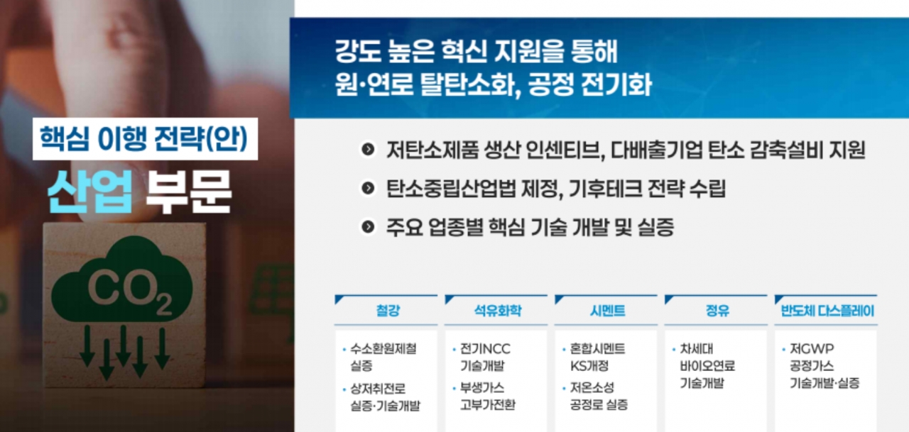 정부는 산업부문 핵심이행 전략으로 강도 높은 혁신 지원을 통해 원연료 탈탄소화, 공정 전기화를 추진하겠다며 저탄소제품 생산 인센티브와 다배출기업 탄소 감축설비 지원, 탄소중립산업법 제정, 기후테크 전략 수립, 주요업종별 핵심 기술 개발 및 실증을 추진 및 지원하겠다고 밝혔다. 이와 관련해 철강 부문에선 수소환원제철 실증과 상저취전로 실증 및 기술개발을 돕는단 방침이다.