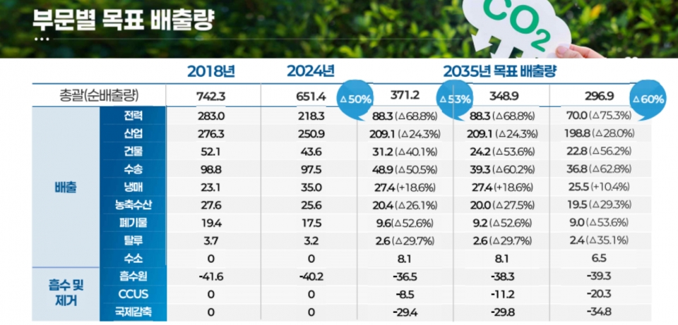 이에 따라 1안 하한선인 ‘50%’에서는 2035년 순배출량이 3억 7,120만 톤을, 2안 하한선인 ‘53%’에서는 2035년 순배출량이 3억 4,890만 톤을, 1~2안의 상한선인 ‘60%’에서는 2035 순배출량 2억 9.690만 톤을 달성해야 한다.