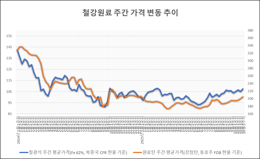 키워드 #철광석 #원료탄 이사무엘 기자 smlee@snmnews.com 다른 기사 보기 관련기사 (주간시장동향 – 특수강봉강) 수요 감소에도 수입 증가 (주간시장동향 – 선재) 수입 감소에도 수입재 비중은 확대 [이슈] ‘철강산업 고도화 방안’…열연·후판 반덤핑 효과는 확인, 구조 개선은 과제로 남아 “한 템포 늦춘 열연”…10월 열연강판, 수출 부진 속 내수 중심 균형 유지 포항제철소 STS 소둔산세공정 ‘작업중지’…단기 수급 변수는 없을 듯 박순석 휴스틸 의장, 박재영·박재균에 지분 55만여주 증여 'K-모듈러산업 미래전략세미나' 개최…“건설·철강업계의 혁신 솔루션” [주간시장동향-국제] ‘공급도, 수요도↓’ 중국 철강價 하락 전환 신한스틸-부산보건대, 산학연협력 엑스포에서 공개 [이슈] 열연강판 막히자 ‘열연 대체 냉연’ 쏟아낸 中…“반덤핑 무력화, 정부 대응 시급” 저작권자 © 철강금속신문 무단전재 및 재배포 금지