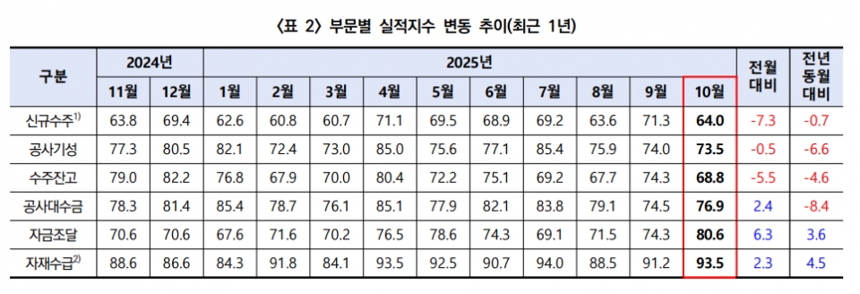 세부 지수를 살펴보면 10월 신규수주지수(64.0)가 전월 대비 7.3p 떨어지며 종합실적 악화 주요인으로 작용했다.