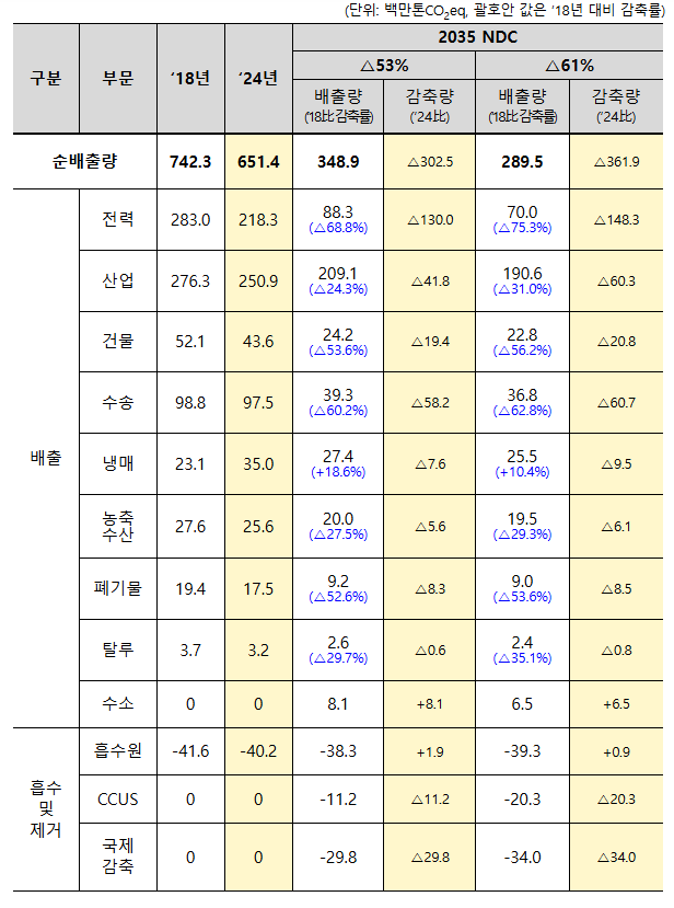 특히 정부는 온실가스 다(多) 배출 제조업 중심의 산업 구조와 감축기술의 실현 가능성 등을 고려하여 산업 부문 감축목표는 2018년 대비 24.3(하한)~31(상한)% 감축하는 수준으로 정했다. 이에 따라 2035년 산업 부문의 순배출량은 하한선에선 2억 910만 톤, 상한선에선 1억 9,060만 톤을 달성해야 한다. 이는 2024년 배출량과 비교하면 16.7~24%를 감축해야 하는 수치다. 정부는 산업계의 목표 달성을 위해 감축 기술 개발을 위한 정부 지원을 확대하고 전환금융 도입 등 전폭적인 지원을 통해 산업의 체질 개선을 뒷받침한단 계획이다.