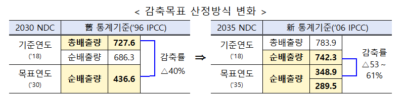 하한 목표인 ‘53%’는 배출권거래제 등 규제와 연동된 목표로 설정·활용된다. 상한 목표인 ‘61%’는 정부지원 대폭 확대, 혁신적 기술개발, 산업 체질 개선 등을 전제로 정부 세부 계획에 반영될 예정이다. 또한 이번 NDC 목표 설정에서부터 기준을 ‘총배출량’에서 ‘순배출량’으로 통일하고 통계를 2006 IPCC 지침에 맞게 적용하기로 했다.