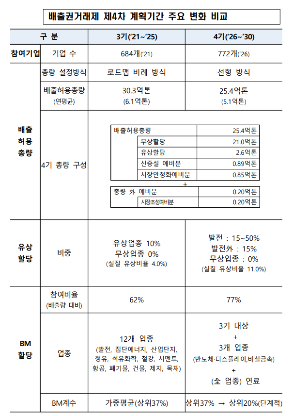 정부는 “현재 배출권 시장은 역대 최고 수준의 잉여량으로 인해 역대 최저 수준 배출권 가격이 지속되어 시장원리에 따른 감축유인을 촉진하는 제도의 본래 목적을 달성하지 못하고 있다는 비판이 있다”며 “이에 따라 정부는 그간 산업계, 시민사회, 배출권시장 전문가 등 다양한 이해관계자의 의견을 수렴하여 국가 온실가스 감축목표(2030 NDC) 달성을 유도하면서 산업계의 감축여건과 업종별 특성을 반영한 4기 할당계획을 수립하기 위해 총력을 다했다”고 설명했다.
