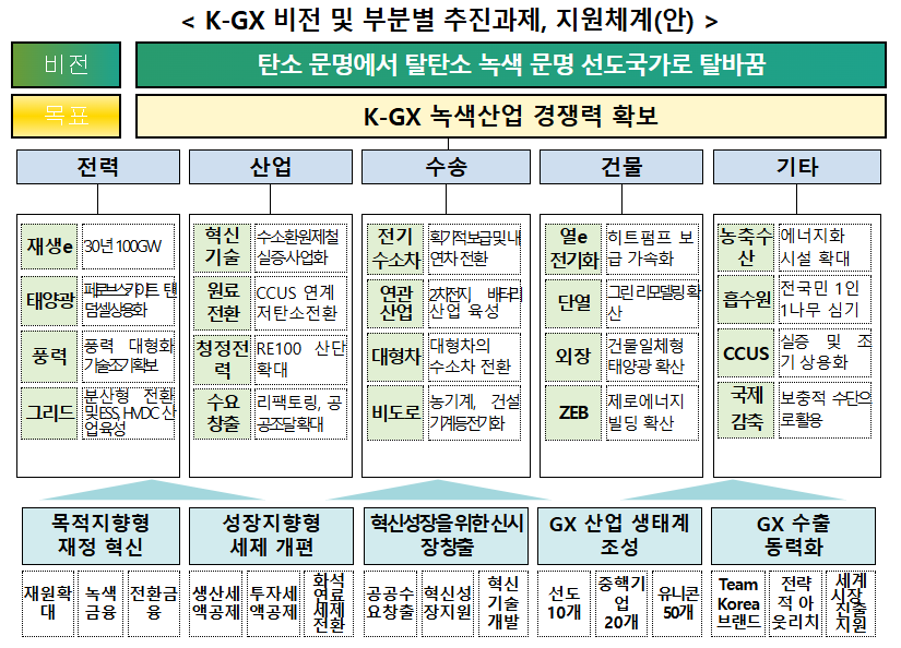 한편, 정부는 2035 NDC 수립의 후속 조치로 태양광, 풍력, 전력망, ESS 등 녹색산업 육성을 위한 세부 추진 과제를 담은 K-GX(녹색전환) 정책안을 관계 부처, 산업계 등과 함께 내년 상반기까지 수립할 것이라고 밝혔다. 철강 부문에선 수소환원제철기술 실증 및 사업화가 포함될 예정이다.