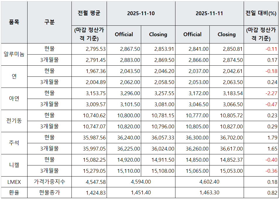[표] LME 비철금속 및 환율 동향(11월 11일)