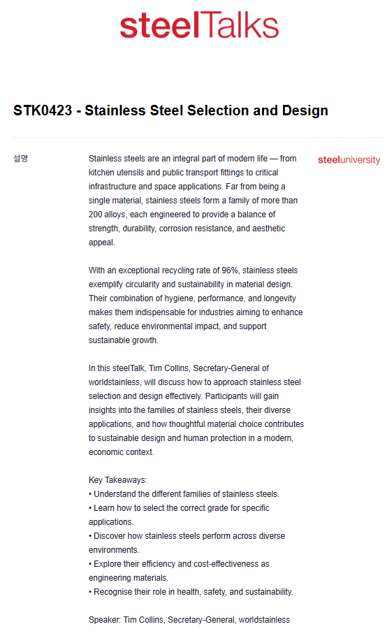 이번 웨비나는 ‘스테인리스스틸 선택 및 설계(Stainless Steel Selection and Design)’를 주제로 세계스테인리스협회 팀 콜린스 사무총장이 발표를 맡을 예정이다.