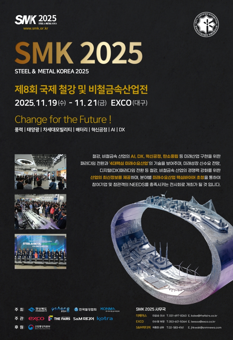 철강 및 비철금속 산업의 미래를 조망하고 위기 극복을 위한 전략을 제시하는 ‘제8회 국제 철강 및 비철금속산업전(Steel & Metal Korea 2025, 이하 SMK2025)가 오는 11월 19일(수)부터 21일(금)까지 3일간 대구 EXCO에서 개최된다.