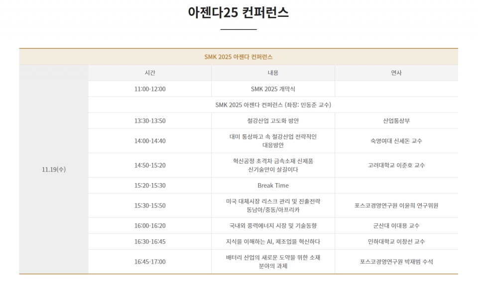 현재 진행 예정인 주요 발표로는 산업통상부의 ‘철강산업 고도화 방안’, 포스코경영연구원의 ‘미국 대체시장 리스크 관리 및 진출전략 동남아·중동·아프리카’, ‘배터리 산업의 새로운 도약을 위한 소재 분야의 과제’와 학계에서 발표하는 ‘대미 통상파고 속 철강산업 전략적인 대응방안’, ‘혁신공정 초격차 금속소재 신제품 신기술만이 살아남는다’, ‘국내외 풍력에너지 시장 및 기술동향’, ‘지식을 이해하는 AI, 제조업을 혁신하다’ 등이 있다. 주제 발표 진행 및 패널 토론을 이끌 좌장에는 정부 철강산업 경쟁력 강화 태스크포스팀에서 공동위원장을 맡은 연세대학교 민동준 명예특임교수가 자리한다.