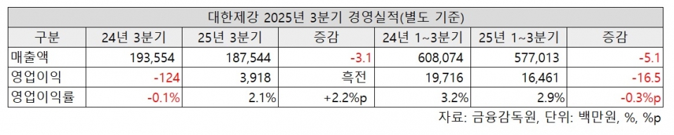 금융감독원에 따르면 올 3분기 별도 기준 대한제강 매출액은 1,875억4,400만원으로 전년 동기 대비 3.1% 감소했다.