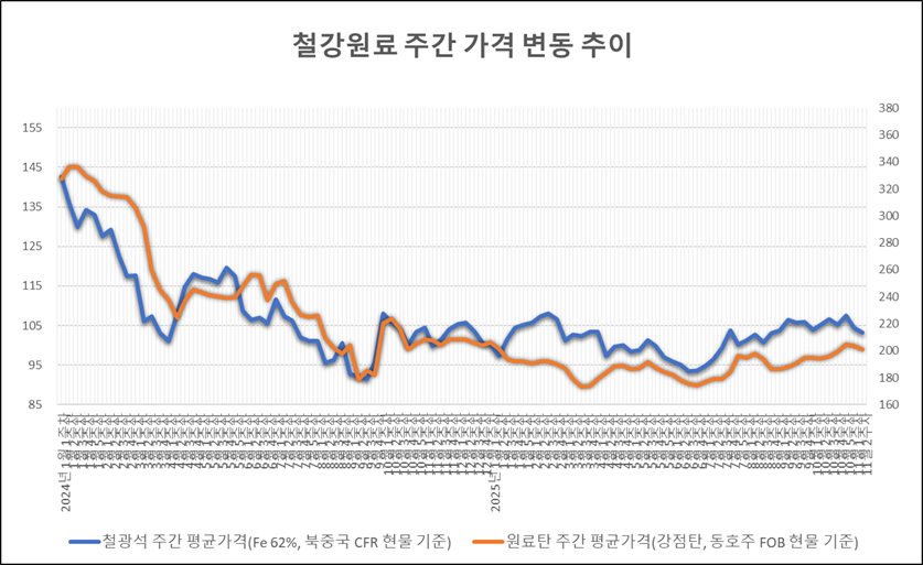 키워드 #철광석 #원료탄 이사무엘 기자 smlee@snmnews.com 다른 기사 보기 관련기사 "씨에스윈드, 내년 美 시장 정책 수혜 기대" [연재] 산업현장 안전에 미래 달렸다 – 코일 운반 작업 중 코일 사이에 끼임 中 조강 생산 6년 만에 10억 톤 미만 가능성↑ 인도, 베트남産 열연·후판 121.55달러 반덤핑 관세 하드웨어 전시회 ‘아이젠바렌메쎄 2026’, 2026년 3월 3일~6일까지 독일 쾰른 개최 특수강업계, 대내외 악재에 3분기 실적 부진 ‘지속’ [주간원료동향] ‘연말 철강 수요 비수기’ 철광석價 2주 연속↓ ‘듣는 기술’이 안전을 바꾼다…RIST·UNIST·포스코 연구팀, AI 챔피언십 3위 “불과 쇠가 다시 만나다”…고대 제철 기술 복원 실험, 현장 공개 포스코 포항제철소, 직접 재배한 농산물 전달식 개최…따뜻한 이웃사랑 실천 중국 열연, 반등 없이 다시 하락…3,200위안대 고착 신호? 반덤핑 이후 구조 변화 지속…열연 SSC, 수익성에 변화 조짐 "동성화인텍, 2026년 보냉재 수익성 증가에 실적 개선" 저작권자 © 철강금속신문 무단전재 및 재배포 금지