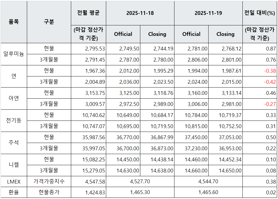 [표] LME 비철금속 및 환율 동향(11월 19일)