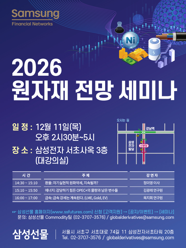 삼성선물이 2026년 원자재 전망 세미나를 오는 12월 11일 오후 2시 30분부터 오후 5시까지 삼성전자 서초사옥 3층 대강의실에서 개최한다.