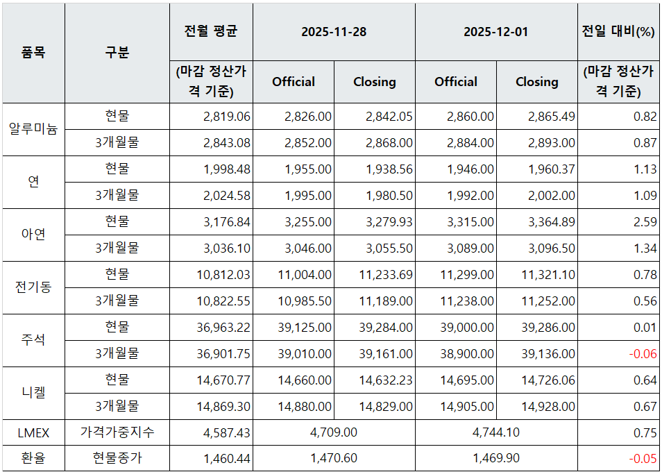 [표] LME 비철금속 및 환율 동향(12월 1일)