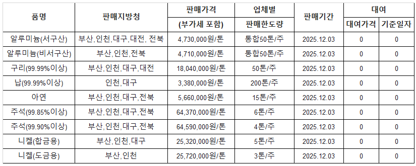 [표] 조달청 방출 가격(12월 3일)
