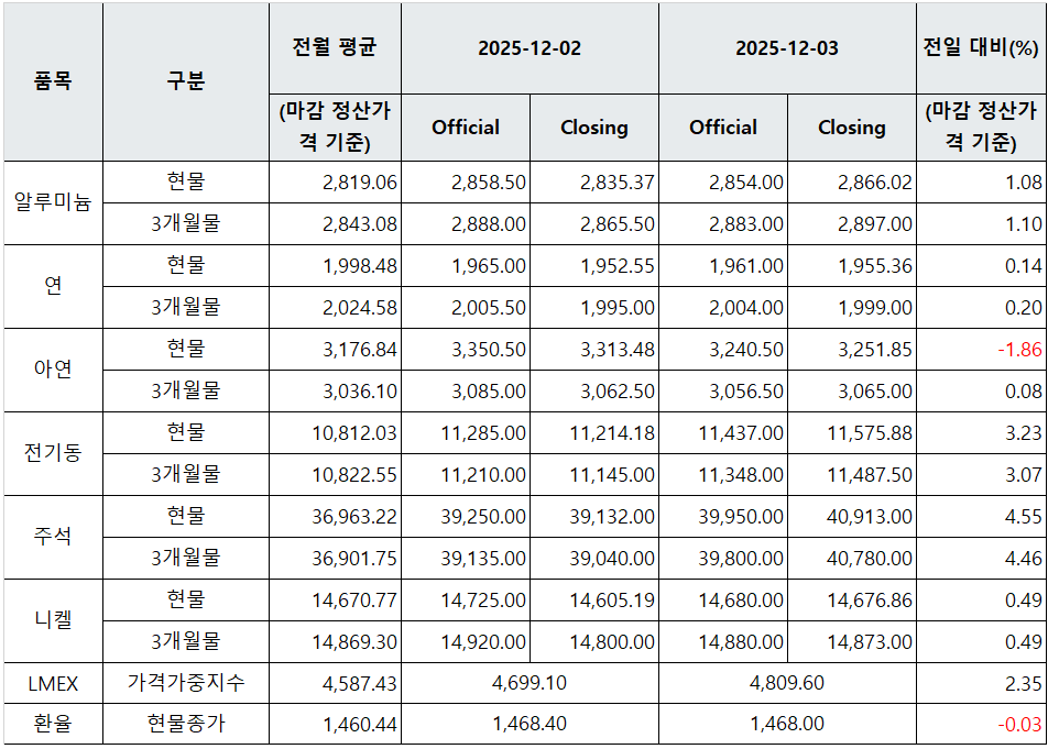 [표] LME 비철금속 및 환율 동향(12월 3일)