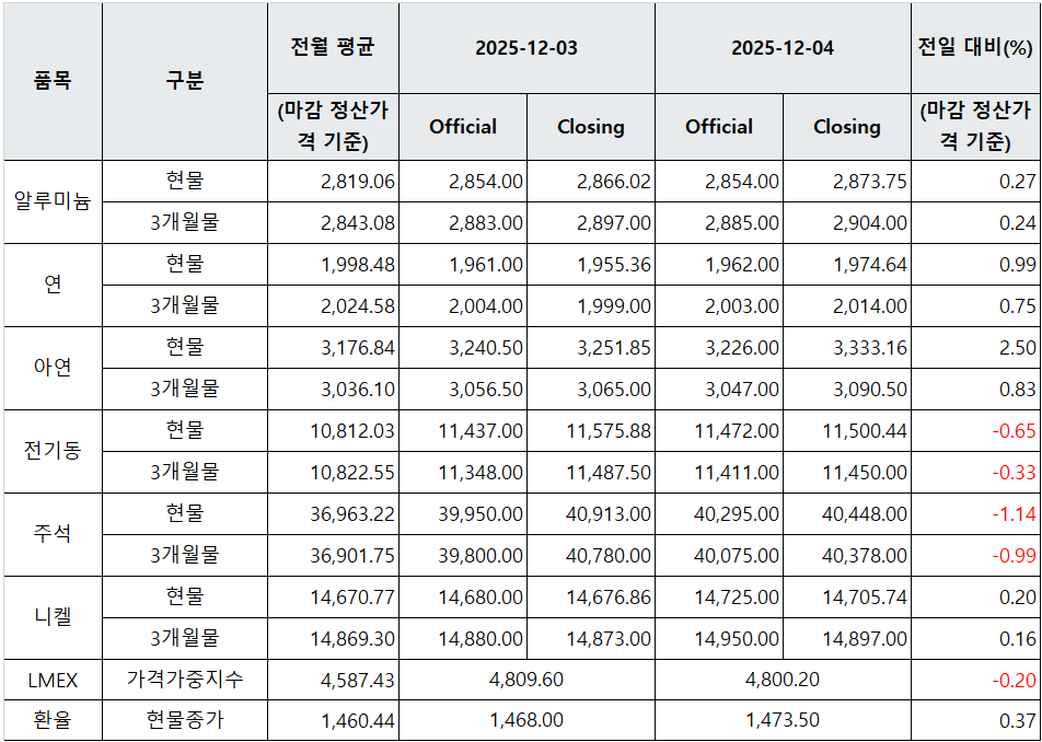 [표] LME 비철금속 및 환율 동향(12월 4일)