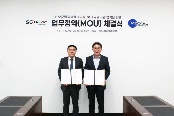 에스지에너지(대표이사 이진섭)는 지난 8일 에스지에너지 대전 본사 대회의실에서 ㈜메카로에너지(대표이사 이재정)와 BIPV(Building Integrated Photovoltaics, 건물일체형태양광) 사업의 공동 추진과 에너지 분야 협력 강화를 위한 업무협약(MOU)을 체결했다.