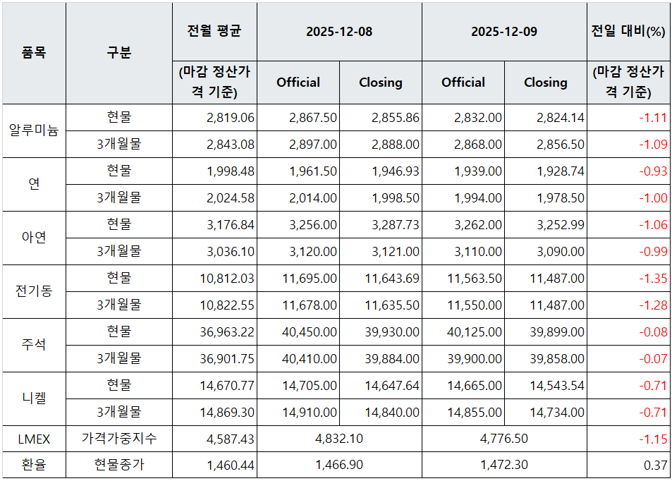 [표] LME 비철금속 및 환율 동향(12월 9일)