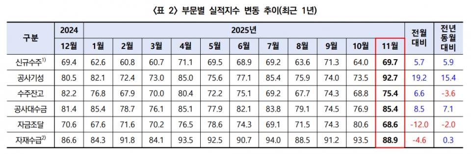 세부 지수를 살펴보면 11월 공사기성지수(92.7)가 전월 대비 19.2p 급등하면서 종합실적 개선 주요인으로 작용했다.