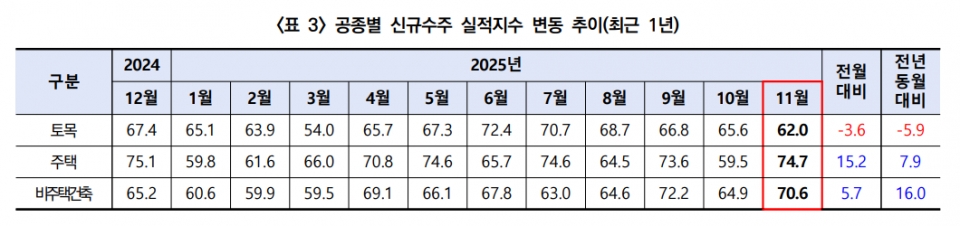 공종별 신규수주의 경우 11월 토목(62.0)이 전월 대비 3.6p 떨어진 반면 비주택건축(70.6)은 5.7p 올랐으며, 특히 주택(74.7)에서 15.2p 급등했다.