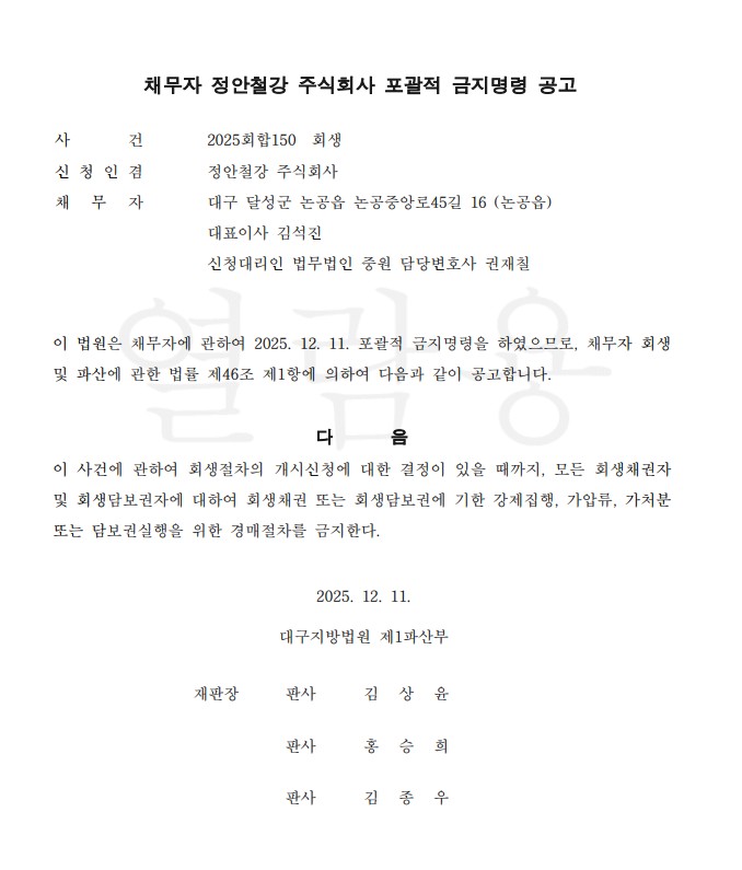대구지방법원에 따르면 법원은 정안철강에 대해 12월 11일부로 포괄적 금지명령을 내렸다. 이에 채무자 회생 및 파산에 관한 법률 제46조 제1항에 의해 이 사건에 관해 회생절차의 개시신청에 대한 결정이 있을 때까지 모든 회생채권자 및 회생담보권자에 대해 회생채권 또는 회생담보권에 기한 강제집행, 가압류, 가처분 또는 담보권실행을 위한 경매절차를 금지했다.