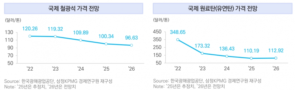 또한 삼정KPMG는 철강 원재료 가격은 약보합세를 예상했다. 연구원은 “2026년에 철강석은 연평균 톤당 97달러 수준, 원료탄(유연탄)은 톤당 113달러 수준이 예상된다”라며 “중국의 조강 생산량이 비교적 안정된 수준을 유지하고 있어 철광석 가격이 2025년 가격 대비 소폭 하락할 전망되지만, 향후 중국발 수요가 급감할 경우 철광석 가격도 추가 하락할 가능성이 있다”고 전망했다.