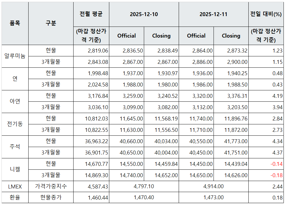 [표] LME 비철금속 및 환율 동향(12월 11일)