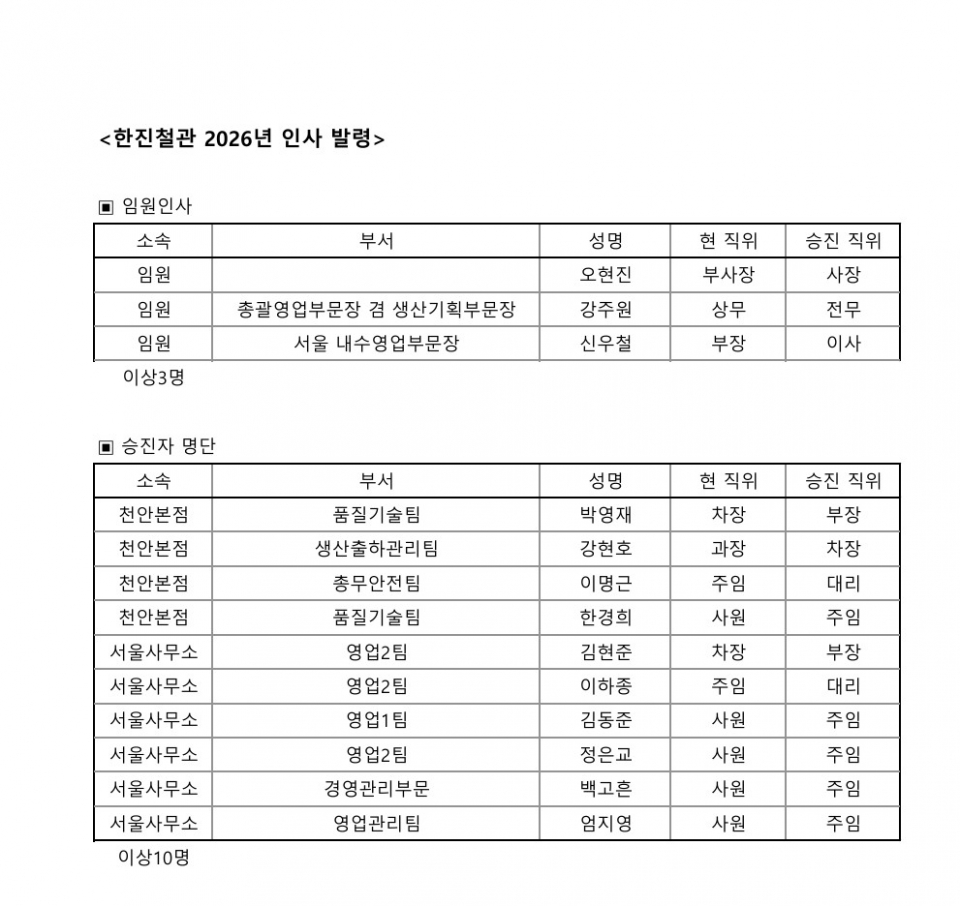 구조관 전문 제조업체 한진철관(대표 이형석)이 2026년 승진 인사를 단행했다. 회사는 이번 승진 인사를 통해 내실 경영과 신성장 동력 강화에 나설 방침이다.