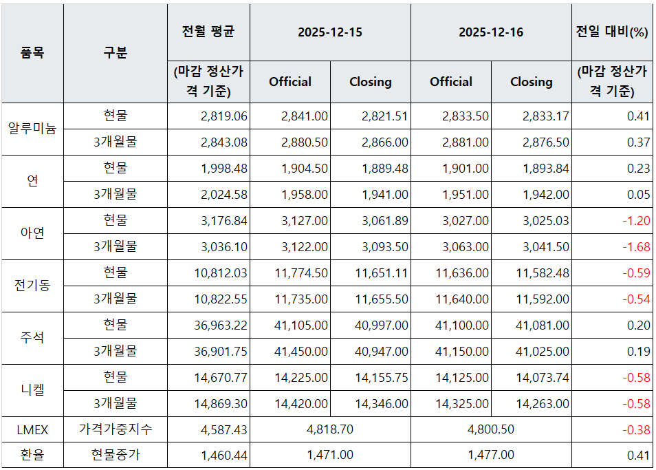 [표] LME 비철금속 및 환율 동향(12월 16일)