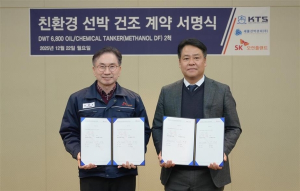SK오션플랜트는 케이티에스해운와 세줄선박관리로부터 6,800톤급 메탄올 이중연료 오일·케미컬 탱커 각 1척씩, 총 2척의 건조 계약(총 약 600억 원 규모)을 체결했다고 23일 밝혔다.