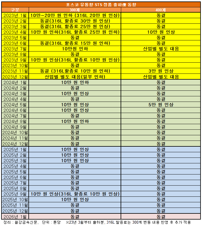 포스코는 1월 300계 및 400계 STS 판재류를 동결한다고 시장에 통보했다. 316L 엑스트라 가격도 동결된 것으로 전해진다. 300계의 경우 2025년 11월 이후 3개월 연속 동결됐다. 400계는 2024년 6월 이후 20개월째 동결이다.