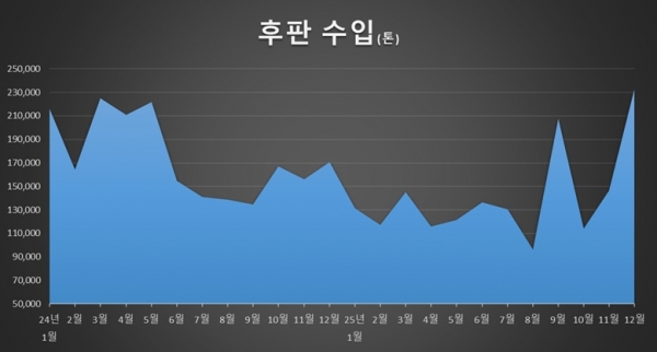 철강업계에 따르면 2025년 12월 후판 수입량은 23만2,914톤으로 집계됐다. 지난 연말 수입은 2016년 9월 26만4,240톤 이후 약 9년 3개월 만에 가장 높은 월간 수치로, 최근 10년을 통틀어 사실상 최고 수준에 해당한다.