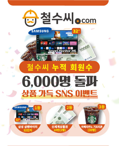 철수씨는 이번 누적 회원 6,000명 달성을 기념해 SNS 이벤트를 마련했다. 이번 이벤트는 회원 여부와 관계없이 누구나 참여할 수 있으며, 인스타그램과 페이스북 등 공식 SNS 채널을 통해 진행된다. 참여를 위해서는 철수씨 공식 SNS 계정을 팔로우한 뒤 이벤트 게시글에 ‘좋아요’를 누르고, 지정된 이벤트 이미지와 응원 문구를 개인 SNS 계정에 게시하면 된다. 이후 이벤트 안내 게시글에 참여 완료 댓글을 남기면 응모가 완료된다.
