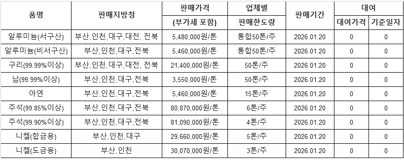 [표] 조달청 방출 가격(1월 20일)
