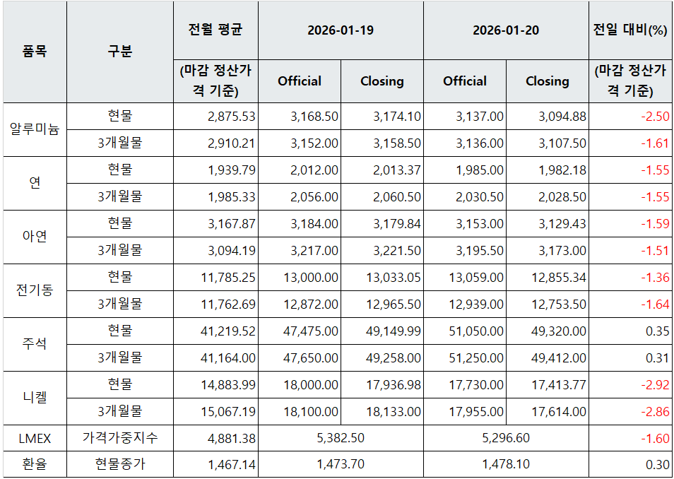 [표] LME 비철금속 및 환율 동향(1월 20일)