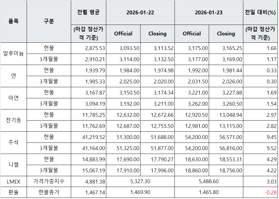 [표] LME 비철금속 및 환율 동향(1월 23일)