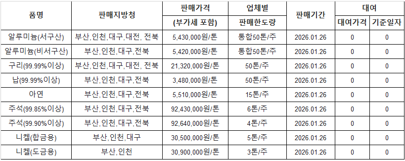 [표] 조달청 방출 가격(1월 26일)